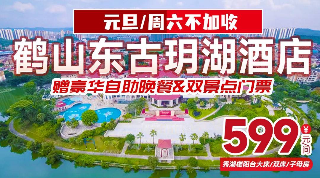 一价全包&元旦/周六不加收!赠豪华自助晚餐+双景区门票(古劳水乡&龟博园)距广佛约1小时车程¥599住鹤山东古玥湖酒店,自助早餐+灯光秀/音乐喷泉/健身房等