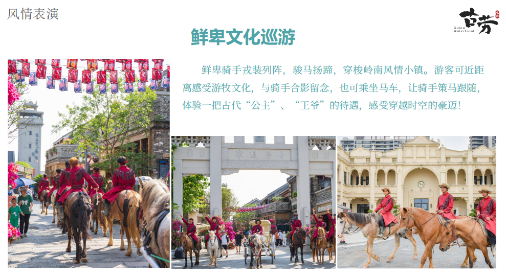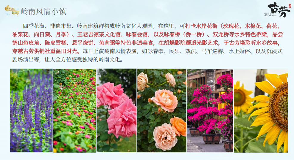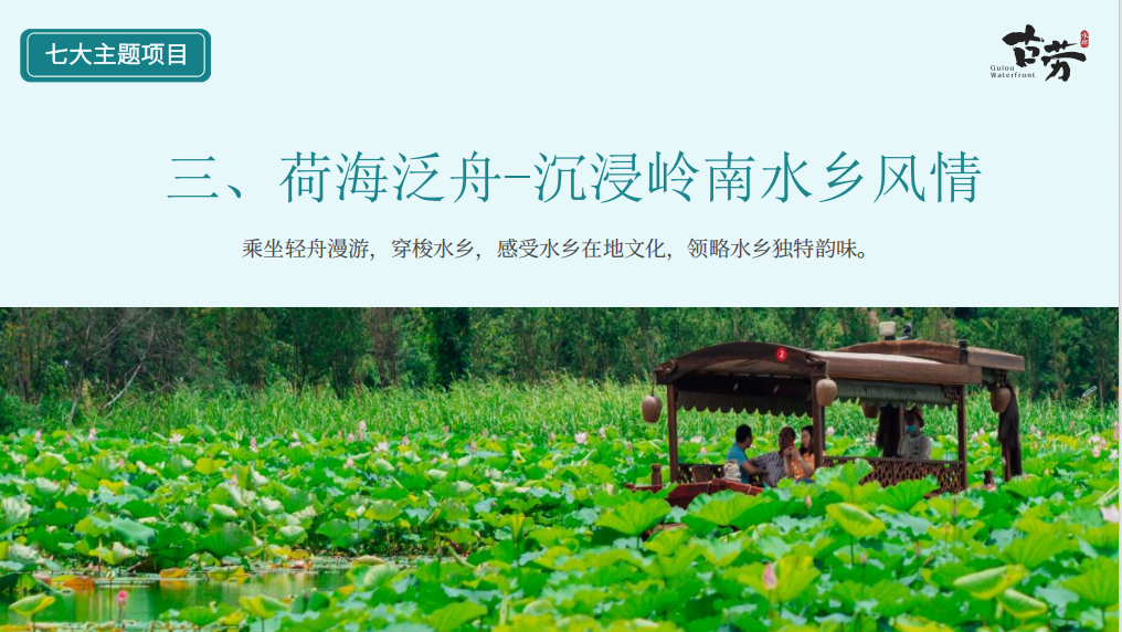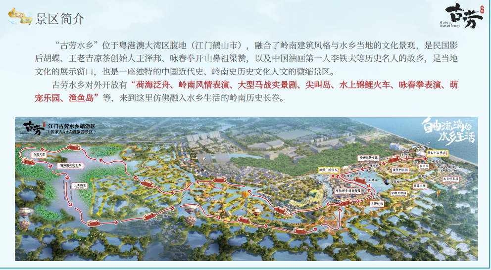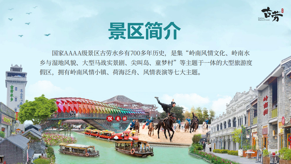 国家AAAA级景区古劳水乡有700多年历史,是集“岭南风情文化、岭南水乡与湿地风貌、大型马战实景剧、尖叫岛、童梦村”等主题于一体的大型旅游度假区拥有岭南风情小镇、荷海泛舟、风情表演等七大主题。