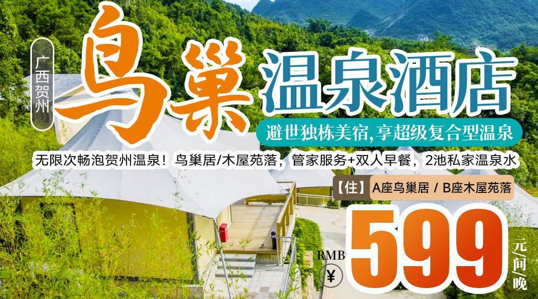毗邻4A景区,避世独栋美宿,享超级复合型温泉!无限次畅泡贺州温泉!¥599抢住贺州鸟巢温泉酒店-鸟巢居/木屋苑落,管家服务+双人早餐,2池私家温泉水