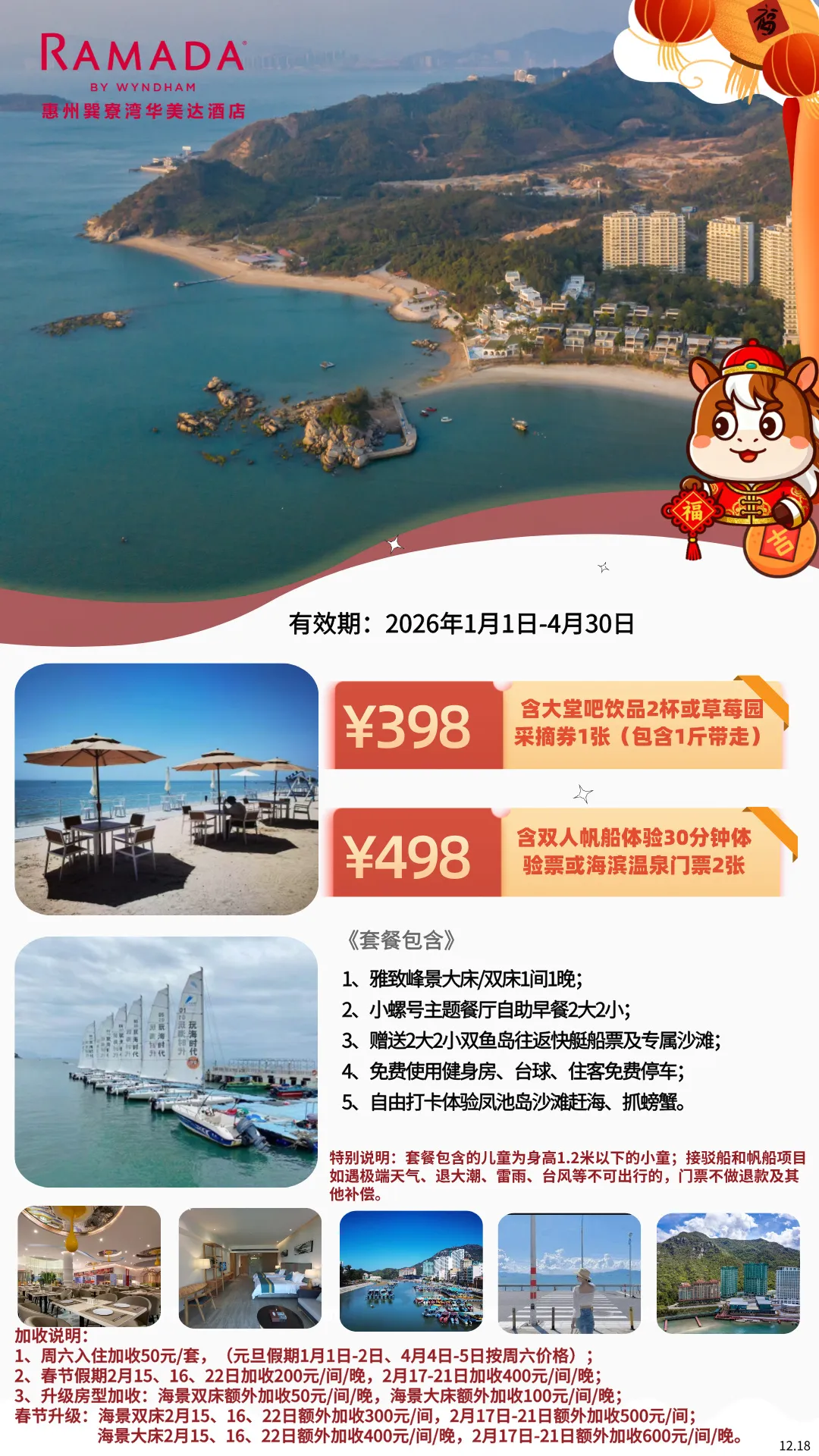 【元旦可约|巽寮湾海边亲子游】2大2小¥398起温德姆旗下-巽寮湾华美达雅致峰景双床房+饮品2杯/草莓采摘1斤/双人帆船出海/海滨温泉门票2张+双鱼岛往返快艇船票及专属沙滩