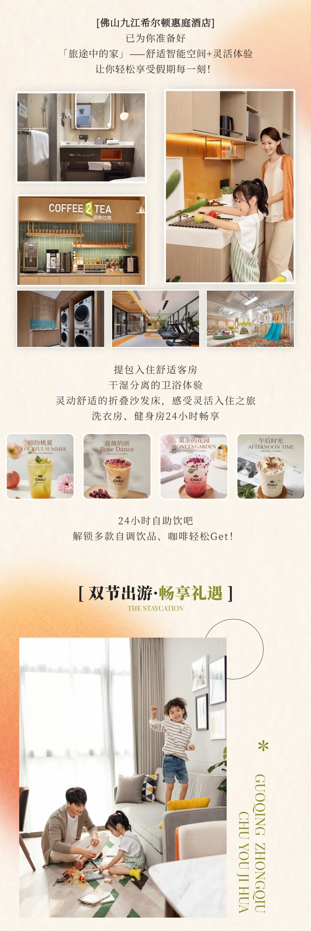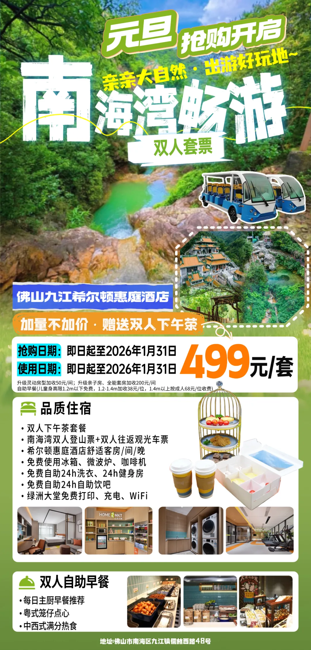 【周末元旦不加收|限量免升灵动客房/家庭子母房】南海湾/西樵山畅游2选1!¥499佛山九江希尔顿惠庭酒店舒适客房+双人自助早餐+南海湾双人登山票&往返观光车/西樵山缆车双人票二选一