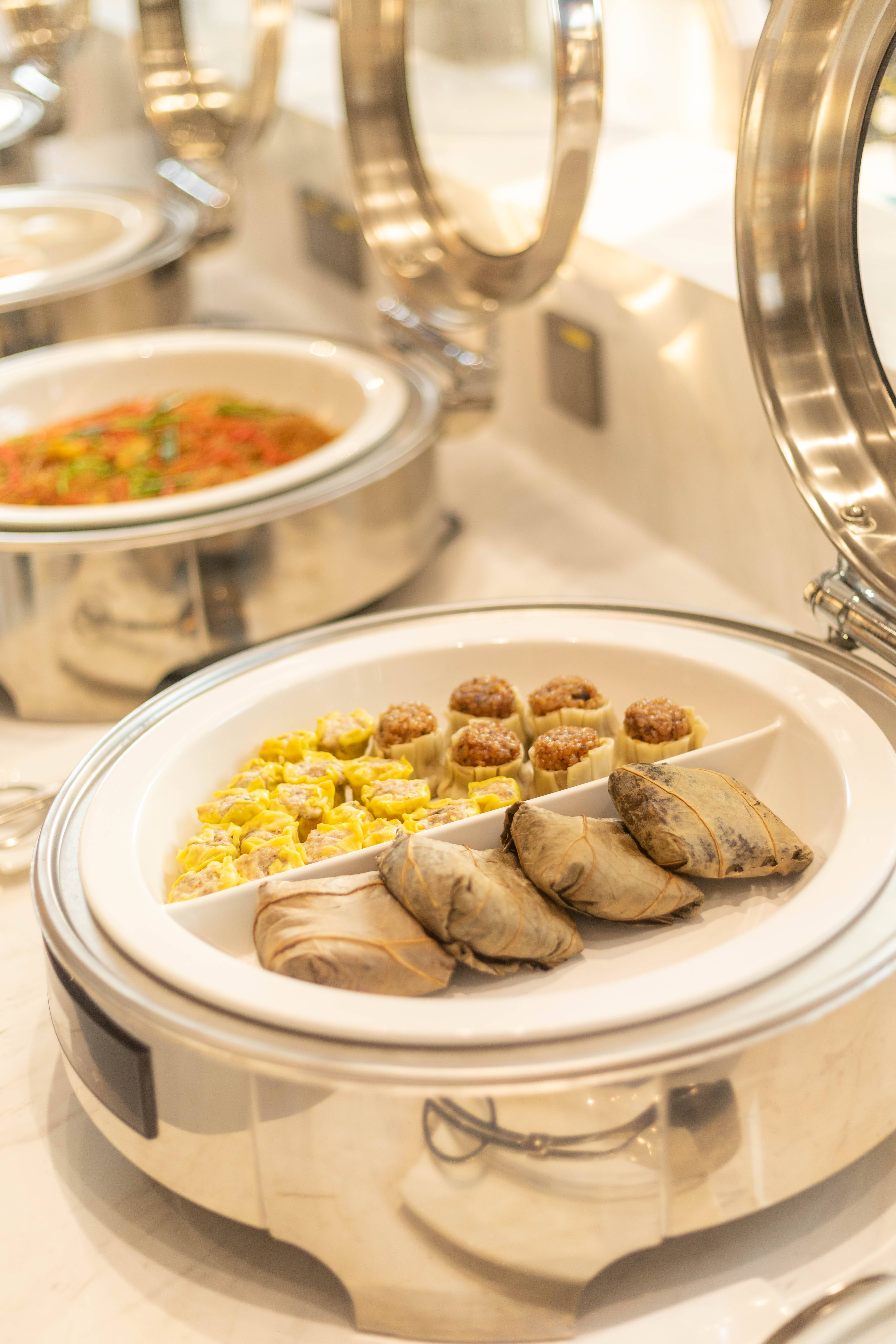 餐厅设计配色延续了灰色和金色,但在软装上使用孔雀绿、深橘棕,布艺材质更加复古典雅。餐厅提供了多样化的餐饮选择和优质的服务,是旅游或出差用餐的不二选择