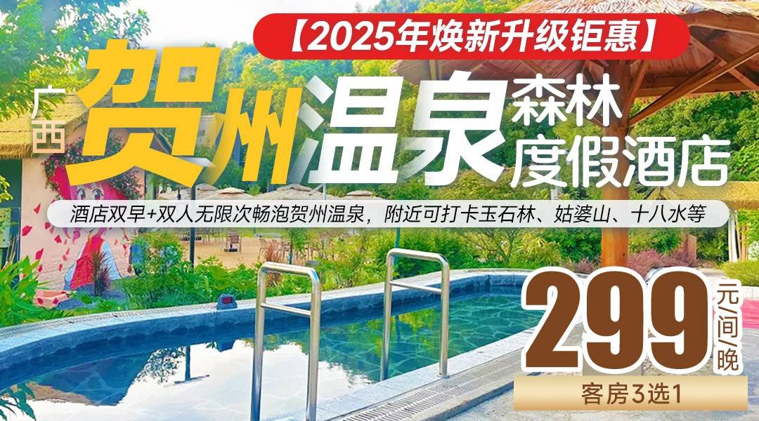 【2025年焕新升级钜惠】贺州高性价比温泉+森林式度假,¥299住贺州温泉森林度假酒店,酒店双早+双人无限次畅泡贺州温泉,附近可打卡玉石林、姑婆山、十八水等