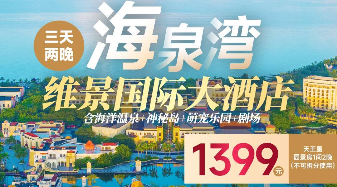 【3天2晚梦幻之旅】元旦限量不加收!¥1399起住珠海海泉湾-维景大酒店天王星园景房2晚,享2大2小早餐+海洋温泉+神秘岛+萌宠乐园+梦幻剧场表演