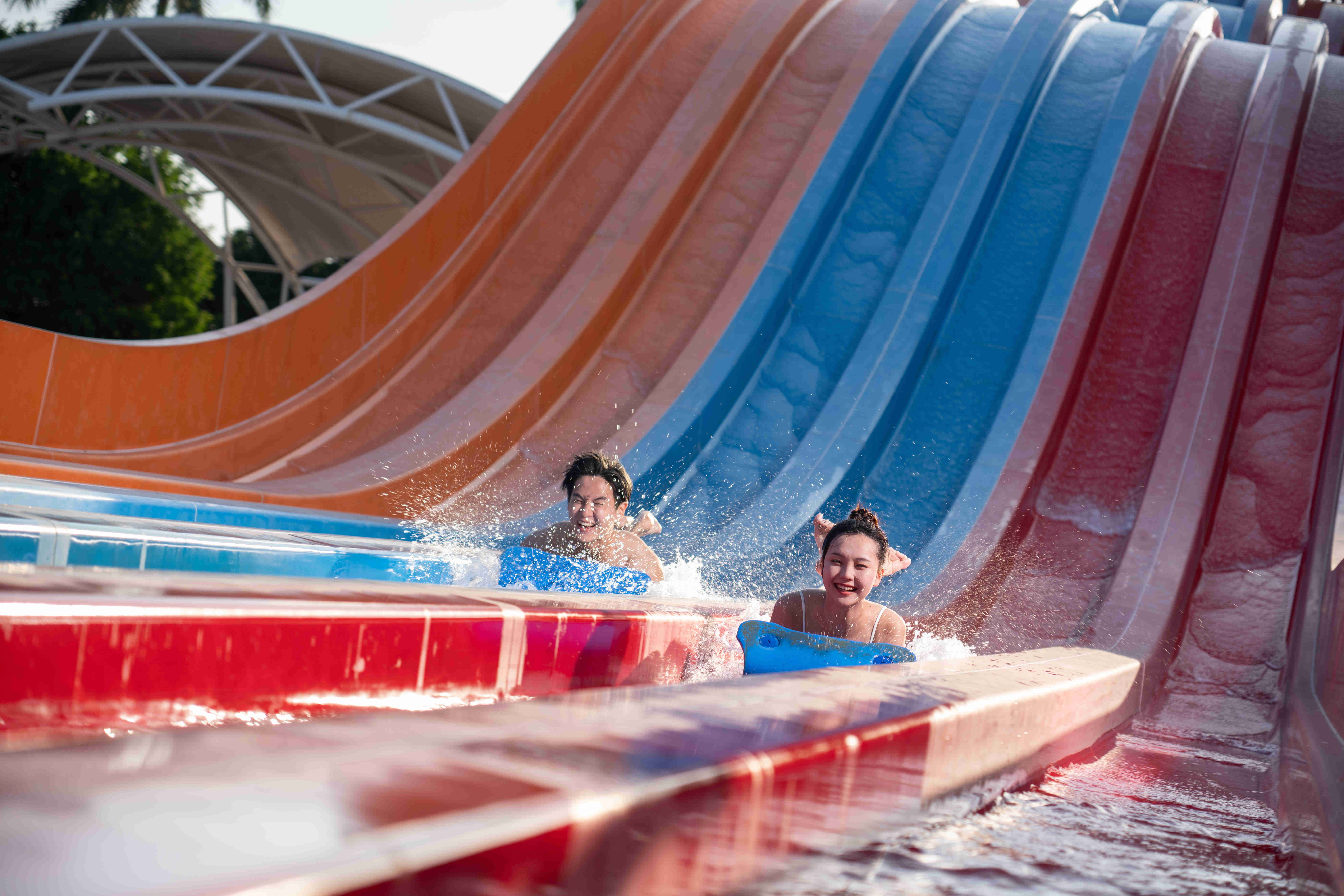 十米多高的彩虹滑道、造浪泳池、高空旋转滑道、