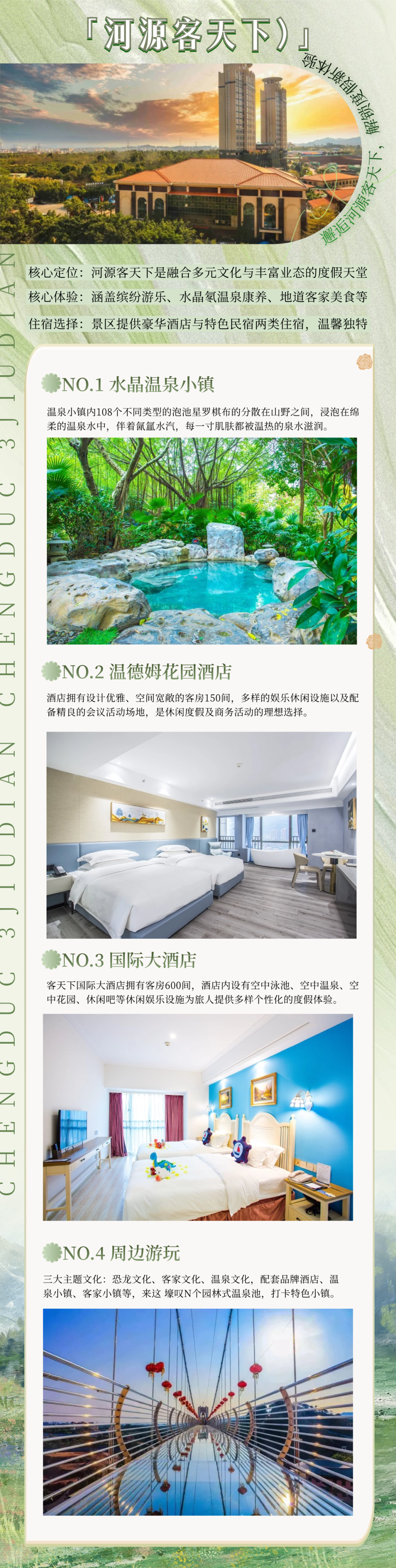 河源客天下国际大酒店环境优美,青山绿水相伴,游玩设施齐全,是聚会团建、研学教育、亲子出游、情侣约会的绝佳选择。客天下国际大酒店拥有客房600间,5种房型:园景房、山景房、豪华套房、猪猪侠酷芽亲子房、超级飞侠酷芽亲子房。此外酒店内设有空中泳池、空中温泉、空中花园、休闲吧、西餐厅等休闲娱乐设施为旅人提供多样个性化的度假体验。