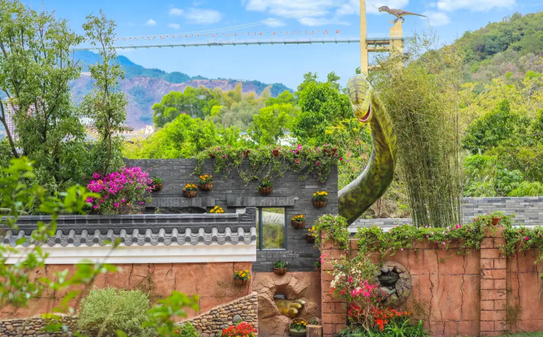 恐龙水晶桥横跨河源客天下两座山峰,群山环绕,气势磅礴。恐龙水晶桥全长288米,高约100米。踏入玻璃桥,犹如踏上天空之镜,河源客天下园区尽收眼底,恐龙水晶桥更有7D效果体验,具有玻璃裂开的效果和声音,能体验一把前所未有的心跳。