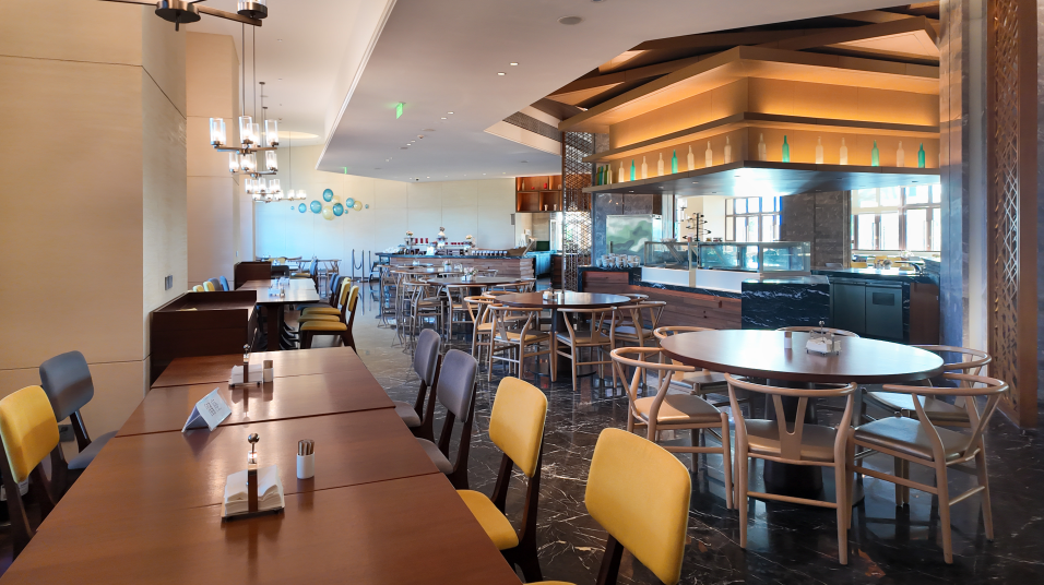 酒店西餐厅坐拥海湾全景,提供丰盛的自助餐及中式或西式菜肴零点服务 ;户外平台亦可欣赏到十分靓丽的夕阳美景。