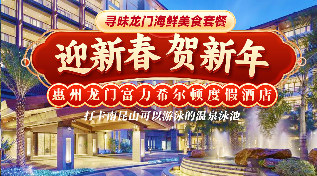 【春节美食专场】温泉泳池+免费康乐放肆玩~¥1298起住龙门富力希尔顿-园景客房,享双早+双人海鲜自助晚+次日自助午餐+无限次酒店温泉+皮划艇、射箭、桌球