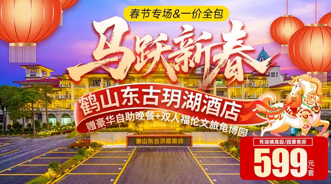 春节专场&一口价!赠豪华自助晚餐+双门票(古劳梁赞故居&龟博园)!¥599住鹤山东古玥湖酒店,自助早餐+灯光秀+烟花篝火狂欢晚会等