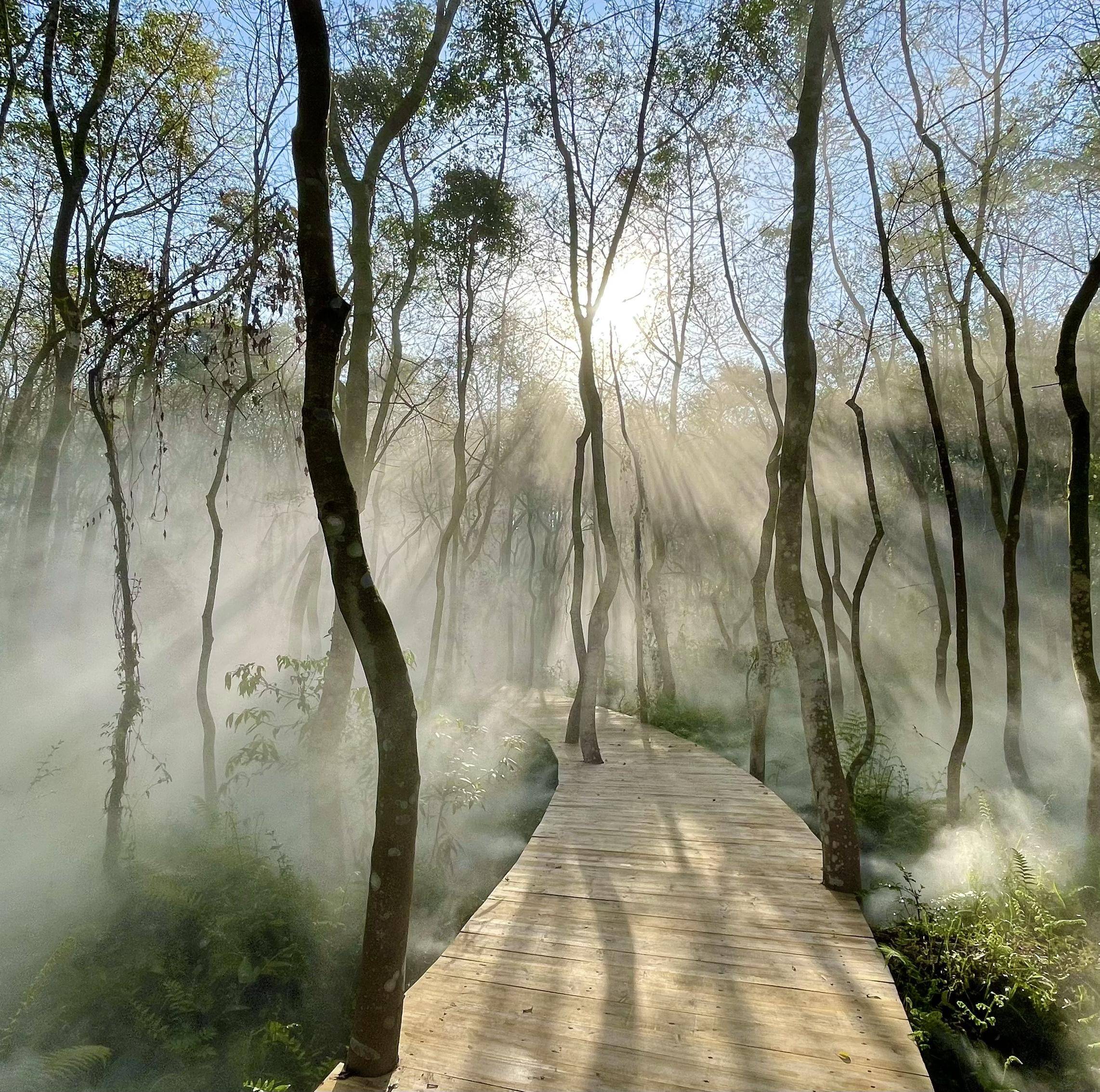 晨起推窗,雾霭轻抚生态林;