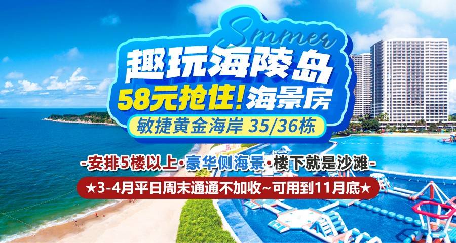 【3-4月平日周六不加收】爆款又来啦!¥58元抢住海陵岛敏捷黄金海岸35/36栋海景双床房,保证安排入住5楼以上,楼下即沙滩!