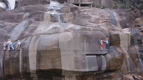 利用岩壁,由铁扶手横梯、固定缆索、岩石塞、踏脚垫等建设而成,让不会攀岩的人也能轻松攀上岩壁,在峡谷瀑布中感受凌波微步。