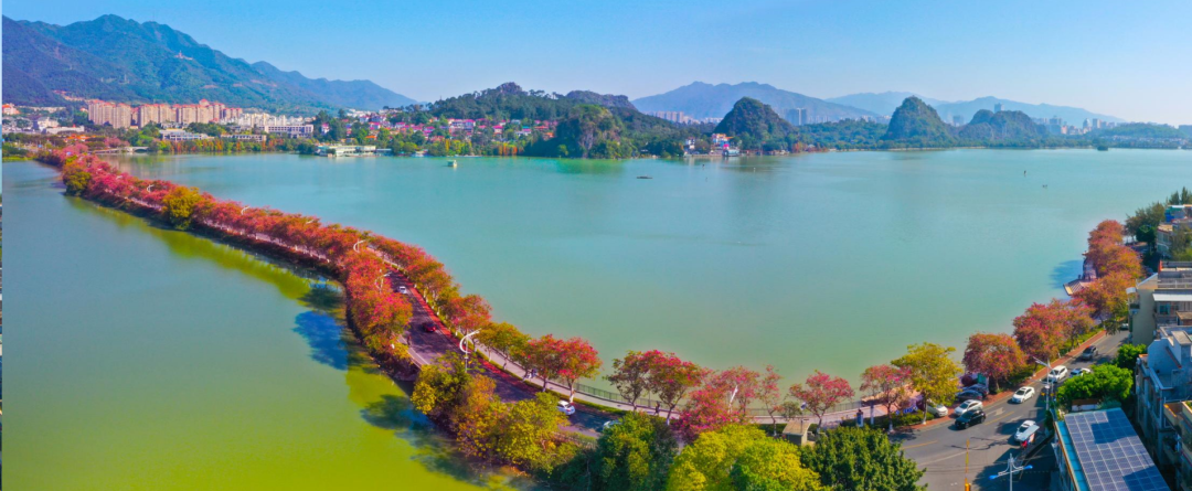每年11月至次年4月,广植在星湖西堤的紫荆花纷纷盛放,将十里长堤染成紫红一片,唯美又壮观。